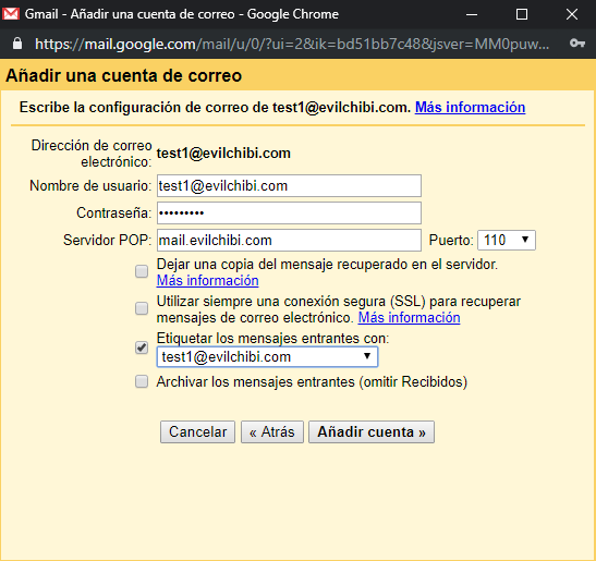 Test1@sudominio.cl para ver que son correos entrantes desde esa cuenta
