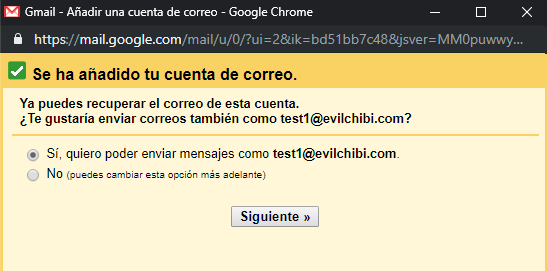 En la siguiente ventana nos consultara si deseamos poder enviar mensajes con el correo que añadimos: test1@sudominio.cl seleccionamos