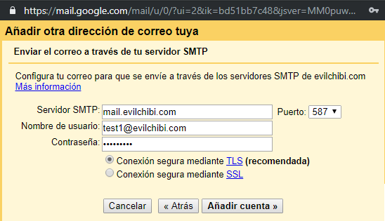 Presionamos sobre “Añadir una cuenta de correo” añadiremos la cuenta correspondiente de correo para este caso test1@sudominio.cl